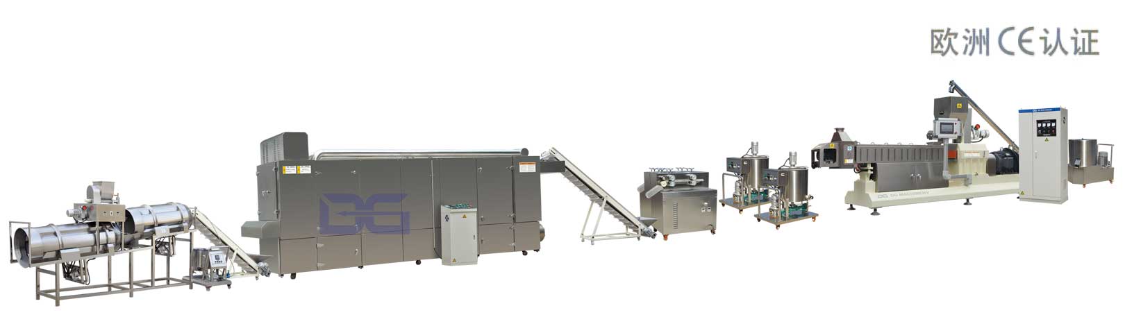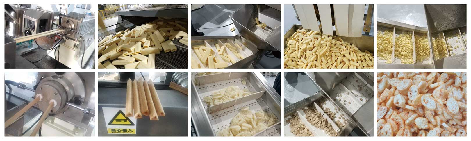 該生產(chǎn)線以玉米粉、大米粉、面粉等為主要原料,經(jīng)雙螺桿擠壓膨化機(jī)擠出空心卷、餅的同時,注餡機(jī)將奶油、巧克力、花生醬等不同口味的餡料注入其中,實(shí)現(xiàn)共擠出,從而賦予了膨化食品更豐富的口味;擠出的夾心卷餅即可滾切、也可直切,可敞口、也可封口;喂料、擠壓膨化、注餡、成型、烘烤、噴涂均流水線生產(chǎn);可變換模具和成型機(jī)生產(chǎn)醬油餅及仙貝,還可變換模具生產(chǎn)各種形狀的膨化休閑小食品。